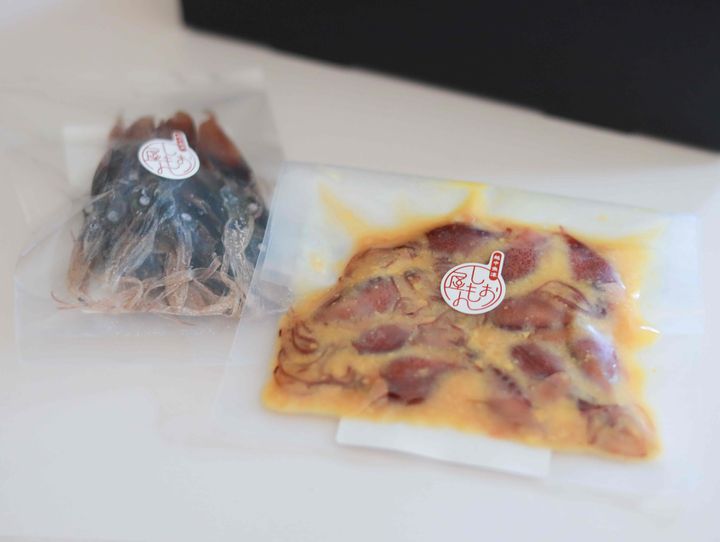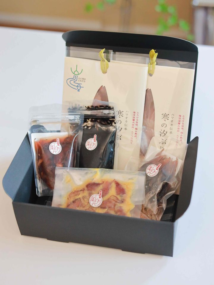 「ハマオカ海の幸」の詰め合わせボックスは、そのまま食べられるのはもちろん、料理にも使いやすいように加工されたほたるいかとぶりがセットになっています
