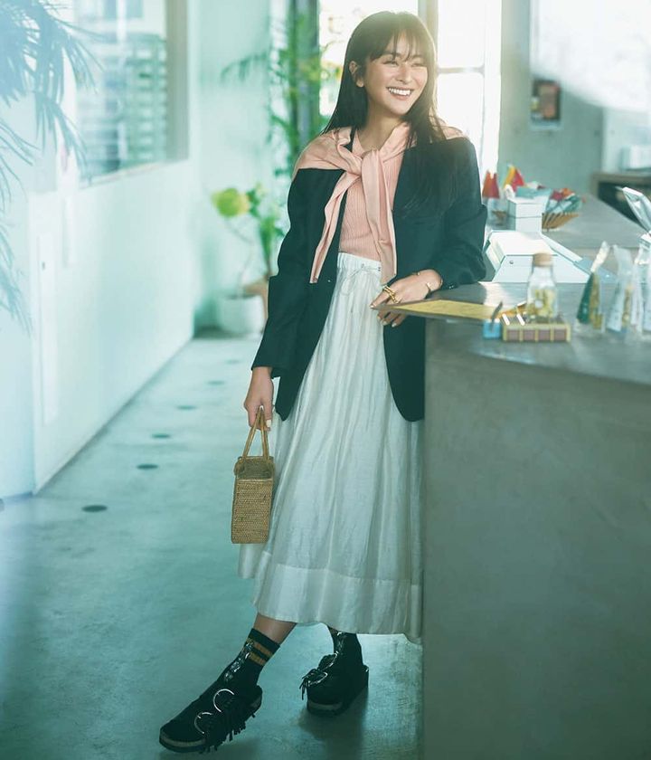 ラインリブソックス¥4,950(FAKUI)ダブルベルトフリンジサンダル¥48,400(ピッピシック/ベイジュ)ジャケット¥64,900(ロンハーマン/ロンハーマン)スカート¥36,300(RHC/RHC ロンハーマン)ノースリーブニット¥40,700肩掛けにしたニットカーディガン¥64,900(ともにローヴァー/ショールーム セッション)バッグ¥18,700(BALI WERKSTATTE/GALERIE VIE Marunouchi)チェーンリング[2本セット]¥34,540〈ベン・アムン〉バングル¥37,180〈ソコ〉(ともにZUTTOHOLIC)