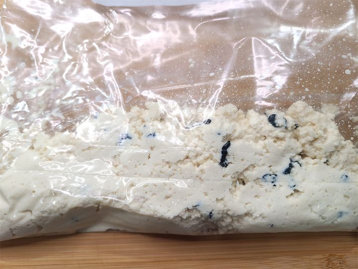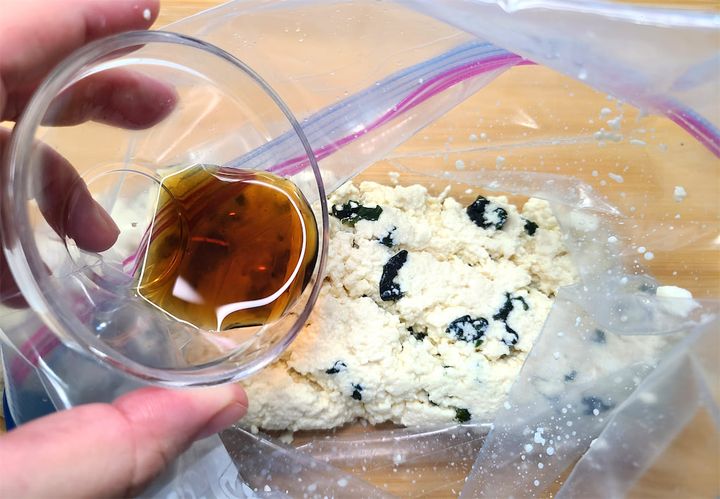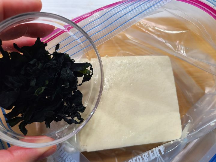 1. 木綿豆腐の水を捨て、ジップ付き保存袋に入れ、乾燥わかめを入れてよく揉み込みます。豆腐は水切りをする必要はありません。