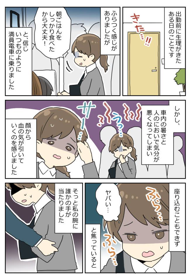 会社に行こうと準備をしていると、生理がきた私。少しふらつく感じがしたものの、いつものように満員電車に乗った結果……。