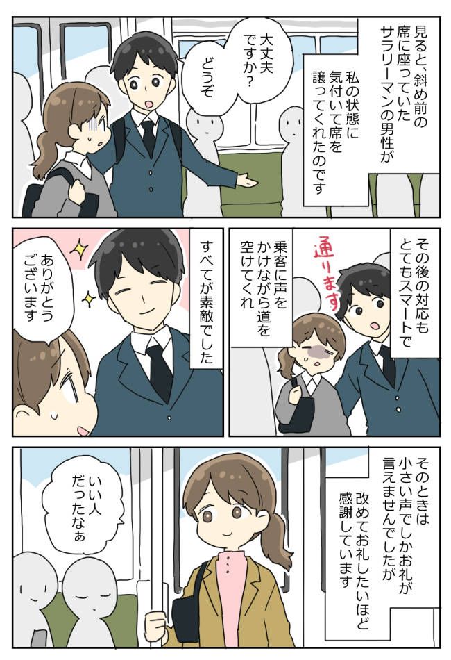 男性はその後の対応もとてもスマートで、乗客に声をかけながら道を空けてくれ、すべてが素敵でした。そのときは小さい声でしかお礼が言えませんでしたが、改めてお礼したいほど感謝しています。