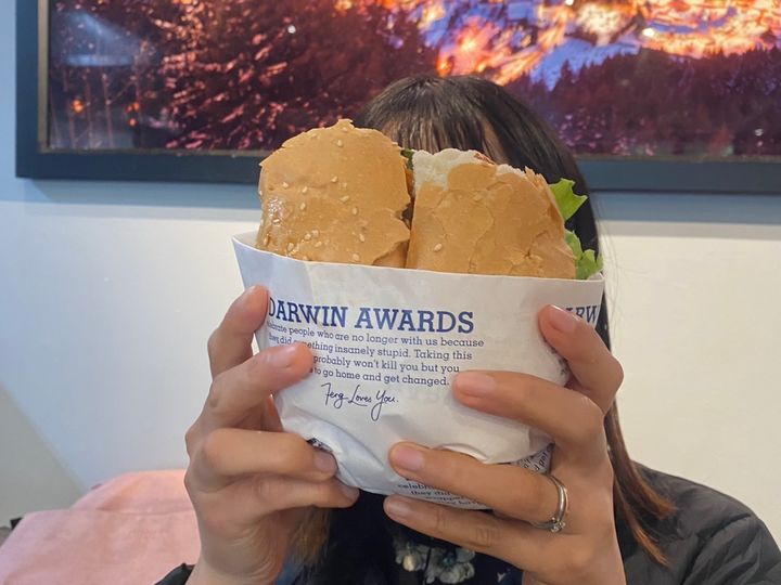 ボリューム満点のバーガーは、私の顔が隠れるサイズ。半分こしたい場合は、「Pleased cut it in half.」と伝えれば、カットしてくれますよ。