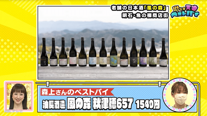 次に天才ピアニストが出会ったのは、買い物帰りの既婚女性。女性のベストバイは、ゲットしたおいしい刺身にピッタリな日本酒・風の森です。風の森は、300年以上の歴史を持つ老舗酒店・油長酒造(ゆちょうしゅぞう)が誇る看板商品シリーズ。魚の棚商店街の酒屋さん・たなか屋で取り扱われており、店員いわく女性客に人気で「かなりフレッシュで、フルーティーで飲みやすい」そうです。