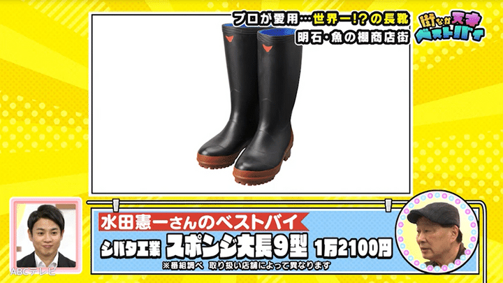 明石の海産物がズラリと並ぶ兼一(かねいち)水産の男性店員は、明石の老舗メーカー・シバタ工業の長靴がベストバイとのこと。「運動靴より楽。蒸れないし、丈夫で長持ちして軽い」らしく、立ち仕事でも足が痛くならないため、「世界一の長靴」と太鼓判を押しました。この長靴は、防寒防水・耐油性に特化しているので、市場や商店街で愛用者が多いそうです。ちなみにシバタ工業では、オシャレで歩きやすいレインブーツを一般向けに販売しています。