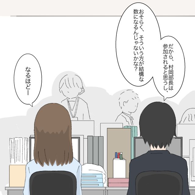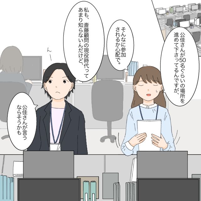 斎藤顧問の送別会の幹事を仰せつかった私が総務部主任の公佳さんに相談すると、想像よりはるかに多い50名くらいの場所が良いとアドバイスをもらいました。経理部に戻り、ともか先輩に「場所は公佳さんが進めてくださってるんですが、そんなに参加されるか心配で。」と報告すると、ともか先輩は「公佳さんがそう言うならそうかも」と言っていました。確かに。公佳さんなら間違いないかな。