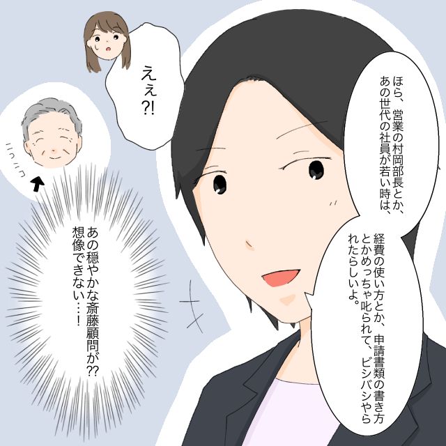 ともか先輩は、斎藤顧問が現役時代の様子を「営業部の村岡部長とか、あの世代の社員が若い時は、経費の使い方とか、申請書類の書き方とかめっちゃ叱られて、ビシバシやられたらしいよ。」と教えてくれました。いまではいつもニコニコと穏やかな斎藤顧問からは想像できない!