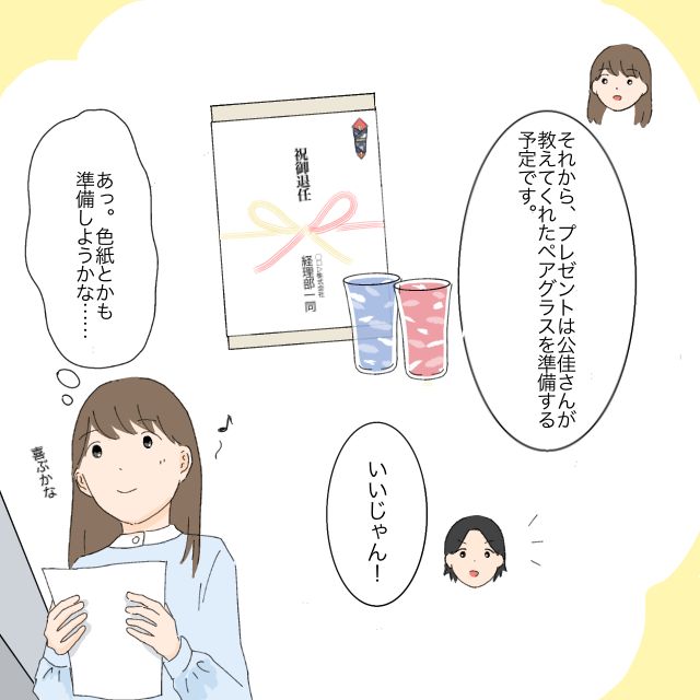 斎藤顧問の送別会の準備が着々と進んでいますね。公佳さんのアドバイスが本当に頼もしいです。厳しく指導してくださった顧問の恩を忘れずに色紙にひと言書きたい社員がたくさんいる、とても雰囲気の良い会社ですね。