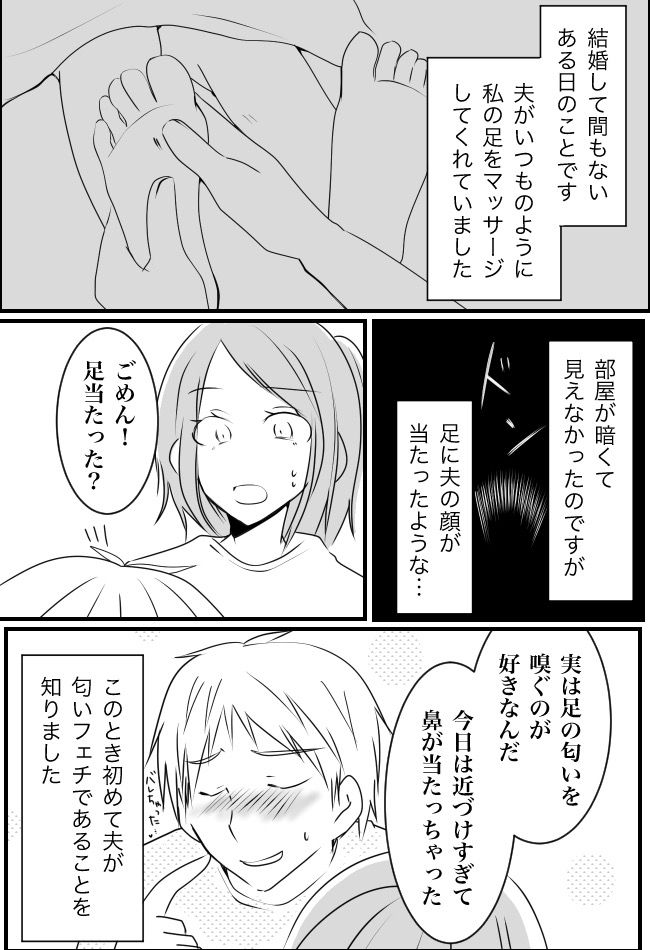 すると、つま先に夫の鼻らしきものが当たったような……。部屋を暗くしていたのでよくわからなかったのですが、私が「鼻に当たった? 大丈夫?」と聞いたところ、夫から驚きの言葉が。なんと、「僕、足の匂いを嗅ぐのが好きなんだ。今日は近づけすぎて鼻が当たっちゃった」と言うのです。