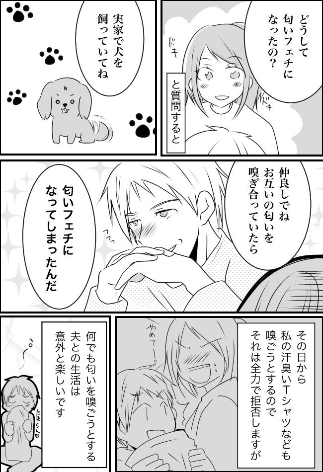 それ以降、私の汗臭いTシャツなども嗅ごうとするので、それは全力で拒否しますが、匂いフェチの夫との生活は意外と楽しいです。