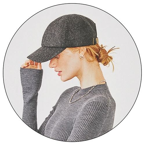 言わずと相性のいい、クールなグレーとシルバーアクセサリー。そこにまぎれて甘いハートモチーフを効かせるギミック。「色は冷たく・素材はあたたかい」キャップも肝。