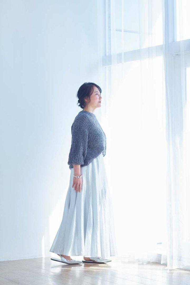 ニット¥30,800、スカート¥39,600/ともにプルミエ アロンディスモン、バングル¥12,100/ビジュー(すべてプルミエ アロンディスモン)、シューズ¥101,200/プロエンザ・スクーラー(ル フィル ニュウマン新宿店)