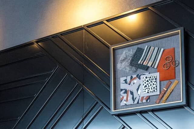 「アトリエで使う本」をモチーフに、壁から吊るされているように見える本革のアートはルームナンバー。目を疑うような遊び心もホテルステイのアクセントです。