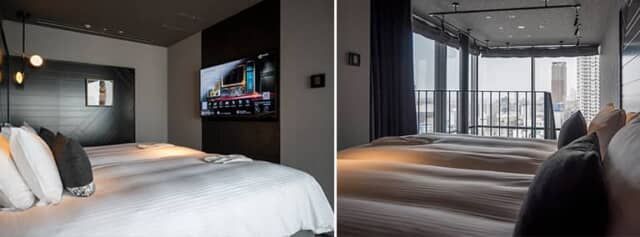 シンプルかつシックなベッドルーム。横110cm × 長さ200cmのベッドが2台置かれ、テレビも設置。ベッドに寝そべりながら、窓の外に広がる都会の風景も満喫。もちろん夜景も素敵です。
