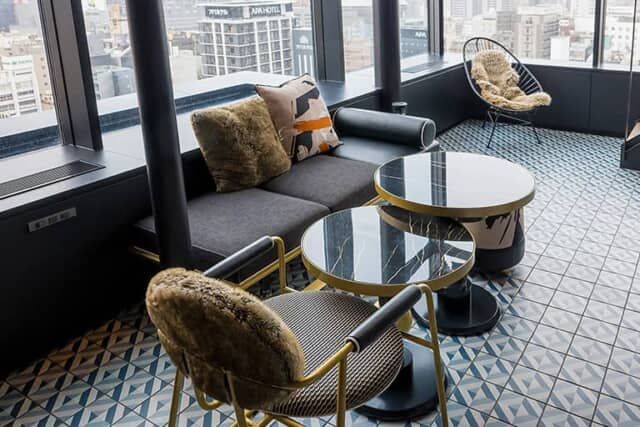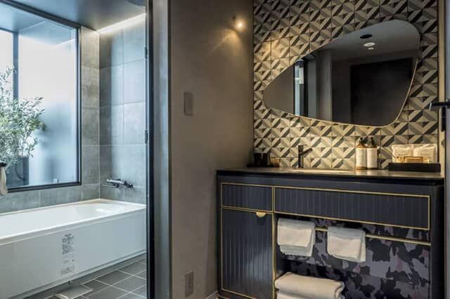 マットブラックを貴重にした客室には幾何学模様のタイルが敷かれ、デザイン性の高い椅子やテーブルをセレクト。高感度なセンスが滞在を印象的にしてくれます。