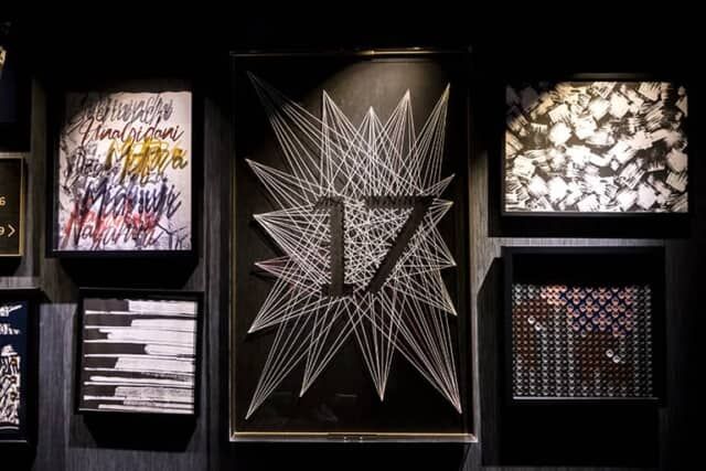 “クリエイターズアトリエ” をテーマにするエレベーターホールのアート。黒いボードに糸を張り、数字を形作る驚きのストリングアート。ボタンや写真なども飾られます