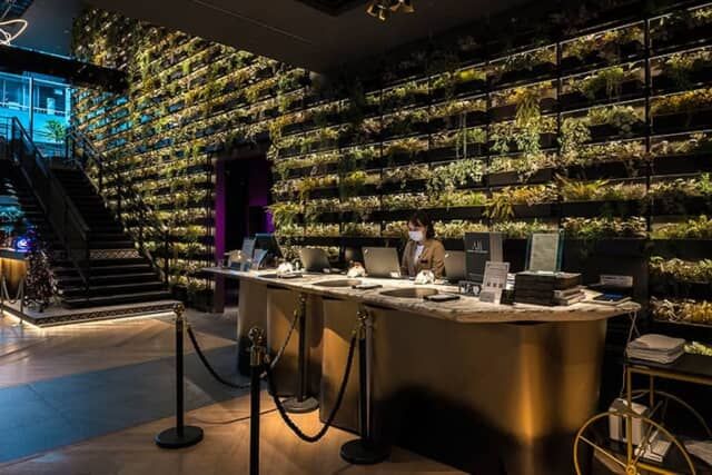 ロビーは中庭に面したガラス張りで、2階分ある天井の高い吹き抜けは開放感抜群。壁一面に飾られたグリーンポッドも圧巻です。夜になるとLEDライトでグリーンポッドが照らされて、これまで見たことのない空間が出現。訪れたゲストの感性を刺激します。