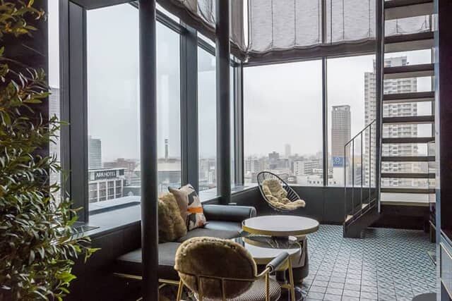 2階続きになったデュープレックススタイル(=メゾネットタイプ)のスイートルーム。54平米の吹き抜けになった角部屋で、17階にある大きな窓からは大都会大阪の街並みを一望できます。