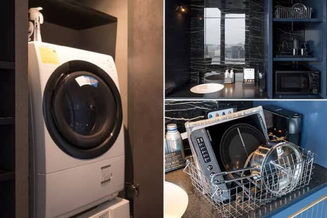 客室に洗濯乾燥機やミニキッチンの設置、電子レンジや調理道具の用意などは、ホテルチェーンの「東急ステイ」が得意とするところ。冷蔵庫は冷凍と冷蔵の2種をそろえます。簡単な料理を作ったり、テイクアウトしたグルメを温めたりと、とても便利に滞在できます。