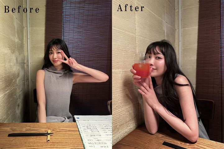 AFTER 飲み物を顔の近くで持ってみる!飲み物を持っている手に片手も添えると、手持ち無沙汰な印象を回避!また、身体を少し斜めに肩を寄せることによって、細見えが約束されます。貪欲に飲み物に前に出てもらうことにより、自分を小顔に見せるという遠近法小癪技も、忘れずにかましましょう。