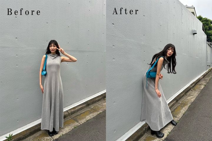AFTER 壁に寄りかかりの芸を披露!ボディラインがぼてっとぼやけやすいワンピースの時も、腰を曲げることで自然とスタイルが良く見えます!手は迷ったら膝に添え、そしてその手にまた手を添え、の添え添えコンビを繰り出すと間違いありません。