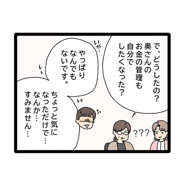 まさか、コウタさんがまだ母親に管理してもらってるとは知らないかがみさんは「で、どうしたの?奥さんのお金の管理も自分でしたくなった?」と聞くと、焦ったコウタさんは「いや・・・やっぱりなんでもないです。ちょっと気になっただけで・・・なんかすみません・・・」とその場を後にしたのでした。