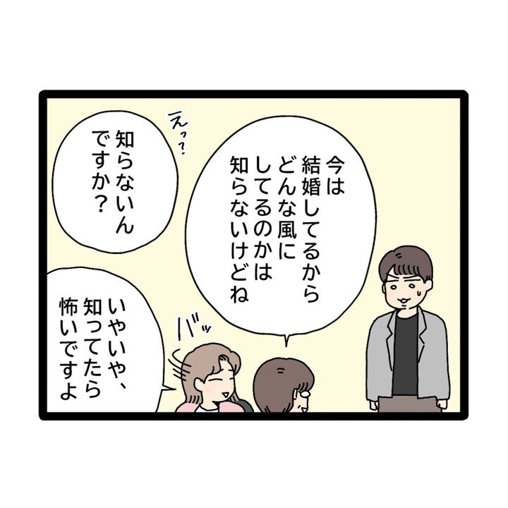 同僚のかがみさんは「今は結婚してるからどんな風にしているのかは知らないけどね」と続けて言いました。それを聞いて「え?知らないんですか?」と驚くコウタさん。