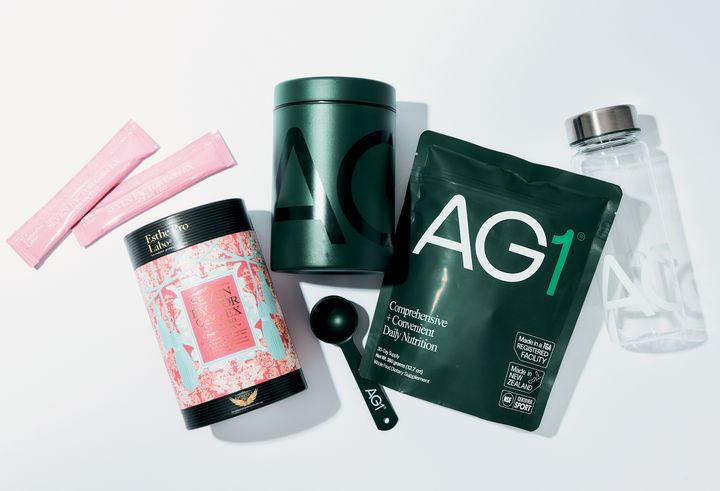 (左)【10の美容成分配合!美味しい美容ジュレ】保湿効果の高いプロテオグリカンを始め、低分子フィッシュコラーゲン、セラミド、ヒアルロン酸などを配合。美味しいアンズ風味のジュレで、ハリアップ。セブンファクタージュレ EX グランプロ 30包¥9,936(エステプロ・ラボ)(右)【75種の栄養が一つに新ウェルネス・ドリンク】マルチビタミン、マルチミネラル、プレバイオティクス、プロバイオティクス、ストレス適応物質など、複数のサプリメントの栄養素が一つになった、水に溶かして飲むタイプ。フルーティーな味。AG1 30食分(キャニスター、スプーン、シェーカー、トラベルパック5袋付き)¥13,599(AG1 JAPAN)