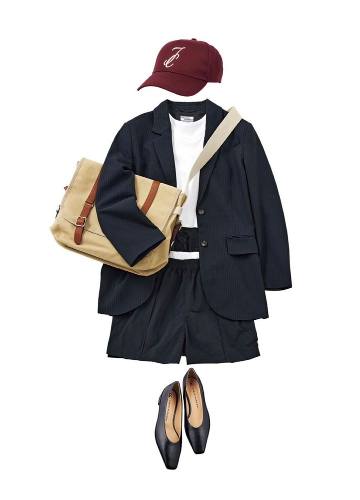 ショートパンツ¥23,100(オートリー/トヨダトレーディング プレスルーム)、中にはいた白いショートパンツ¥26,400(セオリー/リンク・セオリー・ジャパン)、ジャケット¥103,400(バウム・ウンド・ヘルガーデン/S&T)、タンクトップ¥11,000(TW)、キャップ¥38,500(ヤコブ コーエン/ヤコブ コーエン 東京ミッドタウン店)、ショルダーバッグ¥29,500(トゥティエ)、パンプス¥34,100(ファビオ ルスコーニ/伊勢丹新宿本店 本館2階 婦人靴)