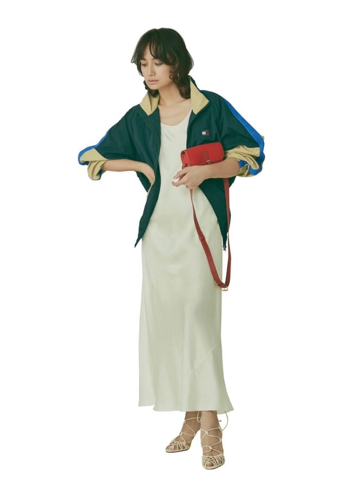 第3位はウインドブレーカーとなめらかなドレスの組み合わせが目を引く佐田真由美さんの着こなし。今季大ブームになっているテック系素材のブルゾンは、それと対照的なエレガントでなめらかな素材感のドレスやスカートと合わせるのが女性らしくまとめるのがお約束。配色がポイントのジップアップブルゾンでシンプルなドレスを一層引き立てて。さらに足元はヒールでバランスUP。