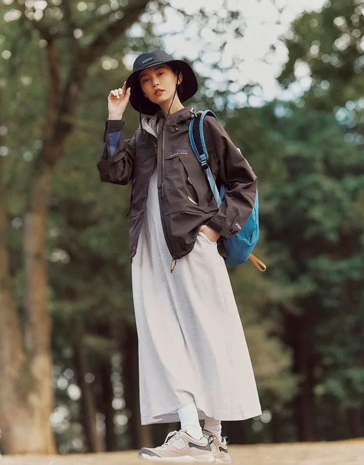 アウトドアムードなシェルジャケットは、ドレスと合わせて女性らしく着ても素敵♥