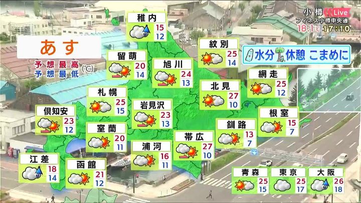日本海側や道南で雨の降る時間がありますが、あすも広く晴れて、気温が上がります。札幌の最高気温は25度、帯広の27度はきょう15日(木)より9度も高くなります。水分や休憩をこまめにとりましょう。
