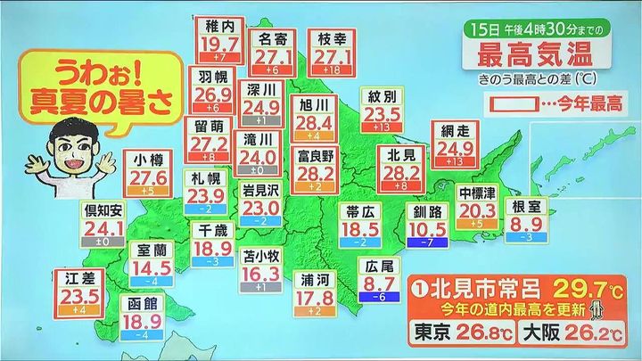 赤枠の地点、道北やオホーツク海側を中心に今年一番の暑さで、旭川や留萌、小樽も今年初の25度以上の夏日になりました。北見市常呂では29.7度と道内の今年の最高気温を更新し、東京や大阪より暑くなりました。