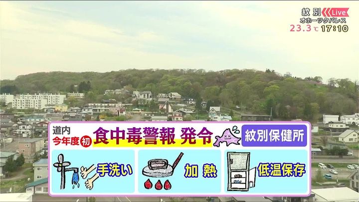 そして、道内では今年度初めて、食中毒警報が紋別保健所から発令されました。手洗いや食材によく火を通す。余ったものはすぐに冷蔵庫に入れるなど食品の取り扱いにも気をつけてください。