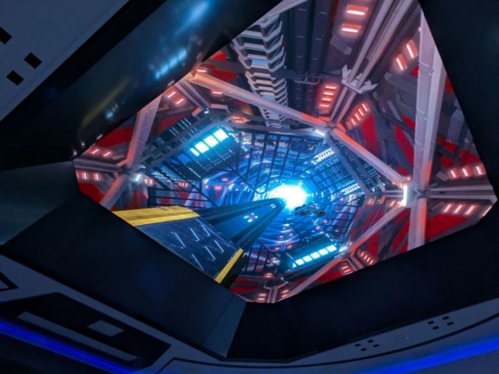 巨大宇宙ステーションの見学ツアーに参加するという設定で体験が進みます。写真は宇宙ステーションに移動する時の映像。到着した宇宙ステーションではガンダムとデブリの戦いが大迫力で展開されます。息子はガンダムを知らないのでどうかなと思っていましたが、世界観に引き込まれてとても楽しかったと言っていました。