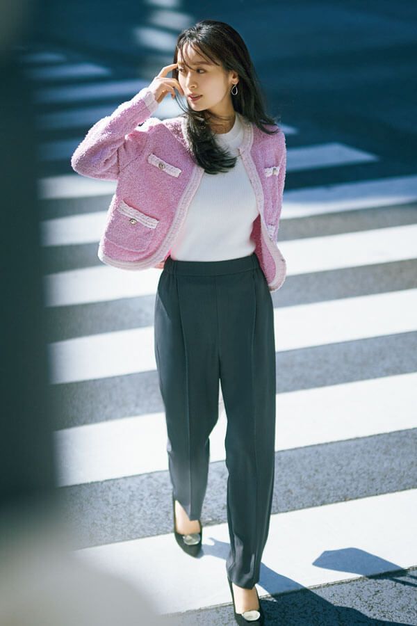 3. 「透明感ピンク」をお仕事で着るなら?ツイード風のジャケットでフォーマルに