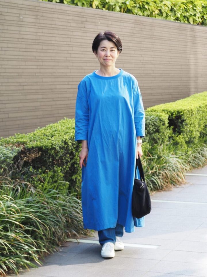 「モノトーンよりも、色を使ったコーディネートが好きです」と話すりえこさん。この日は爽やかな気候にマッチするブルーのワンピースをチョイス。ゆったりとしたシルエットでリラックス感のある装いに。ワンピースと同系色のデニムを重ねた足元には白のスニーカーを合わせてクリーンに仕上げて。