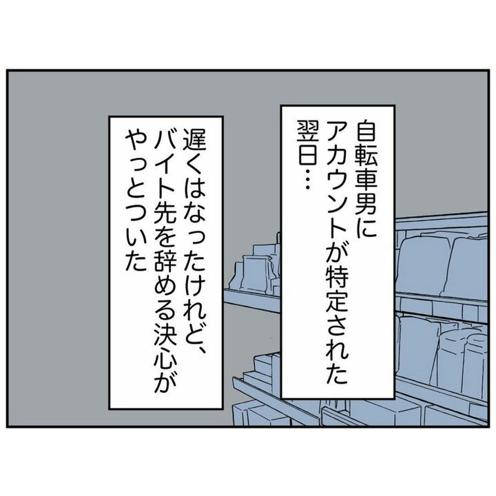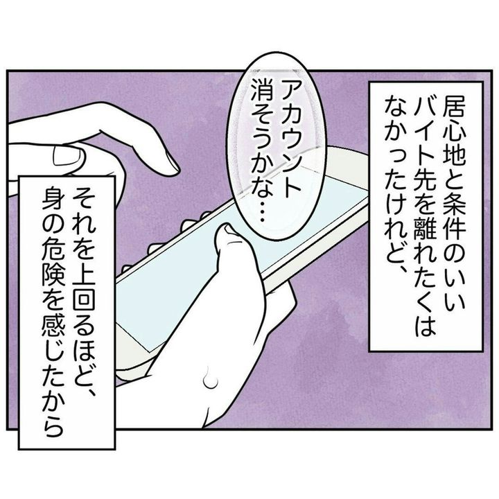 「自分さえガマンすれば」とがまんし続けていましたが、男性客の執着心は増すばかり…。鍵つきのSNSアカウントを特定されてしまったのをきっかけに、バイトを辞める決意をしました。いくら居心地がよくても、肝心なときに守ってくれない店長や本社の元で働き続けるのは危険ですよね。