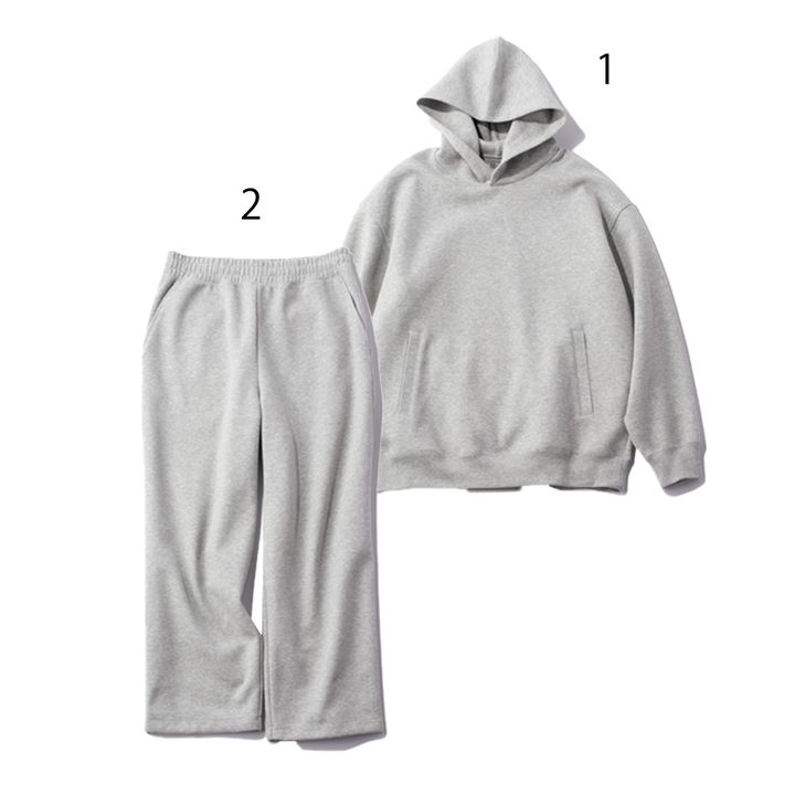 生地表面には適度なハリがありながら、裏面は肌触りがいいのが嬉しい。フーディ¥3,990、スウェットパンツ¥3,990(ともにUNIQLO)[ハリキープ]