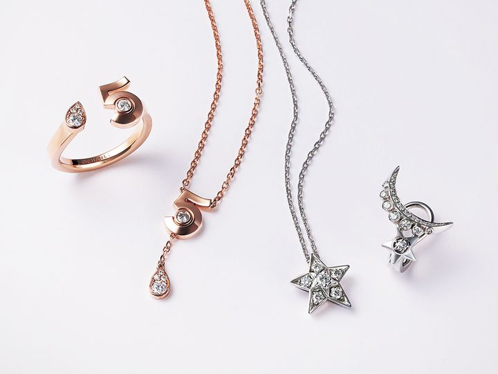 「コメット コレクション」〈WG×DIA〉イヤリング¥880,000 ペンダント¥698,500「コレクション N°5」リング〈BG×DIA〉¥693,000 ネックレス〈BG×DIA〉¥632,500(すべてシャネル)