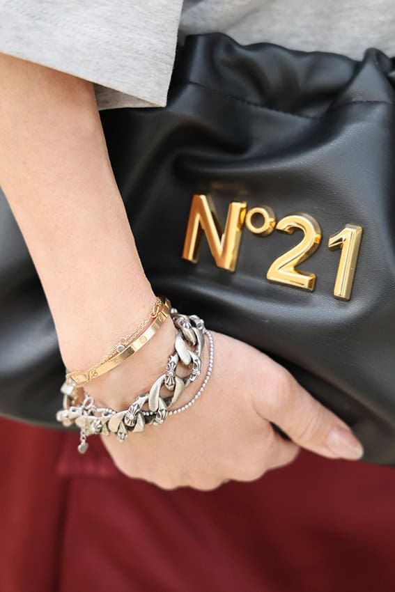 ”こうあるべき”と決め込み、洋服を選んでいましたが、40代を過ぎて固定概念から解放されました。着たいアイテムを、どう自分で料理して着こなすか、以前よりもファッションを楽しめるようになりました。バーガンディのミディ丈のスカートだけでは、少しモノ足りず、小物は黒で引き締め、アクセサリーにシルバーをプラス。ガツンとインパクトを足すには、メンズものを少し多めに加えるのがおススメです。