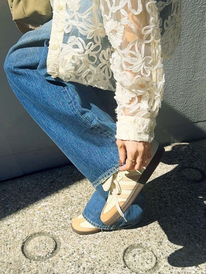 淡いワントーンで統一した春を連想させるコーデ♡ サンバは柔らかな配色とアクセントになるシューレースカバーがポイントです。