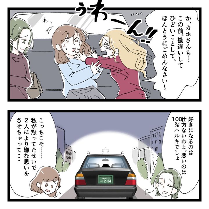 ハルキさんに幻滅したのは、浮気だけが原因じゃないと、セリナさんに対する態度を見て結婚しなくてよかったと思ったとサクラコさんが言いました。何も言えなくなったハルキさんをそのままに、帰ろうとしたサクラコさんとカホさん。すると、サクラコさんが振り返ってセリナさんに「一緒に来る?」と声をかけました。セリナさんは泣きながら立ち上がり一緒に帰ることに。タクシーの中では涙ながらに謝るセリナさんとサクラコさんに対して、「2人により嫌な思いをさせちゃって・・」とカホさんが謝りました。