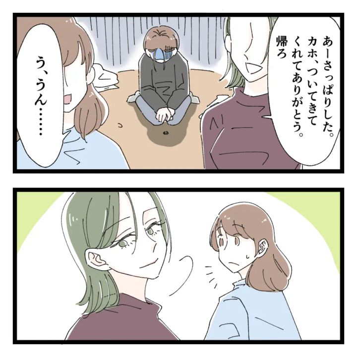 「あーさっぱりした。カホ、ついてきてくれてありがとう。帰ろ」サクラコにそう言われ、「う、うん・・」とうなずいて帰ろうとするサクラコと私。するとサクラコが振り返って、