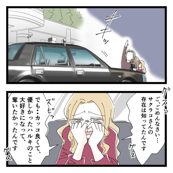 その後、マンションの前までタクシーを呼び、乗り込んだ私たち。「グスッ・・ご、ごめんなさい・・サクラコさんの存在は知ってたんです。でも・・カッコ良くて、優しかったハルキのこと大好きになって、奪いたかったんです」セリナが泣きながら話し出しました。