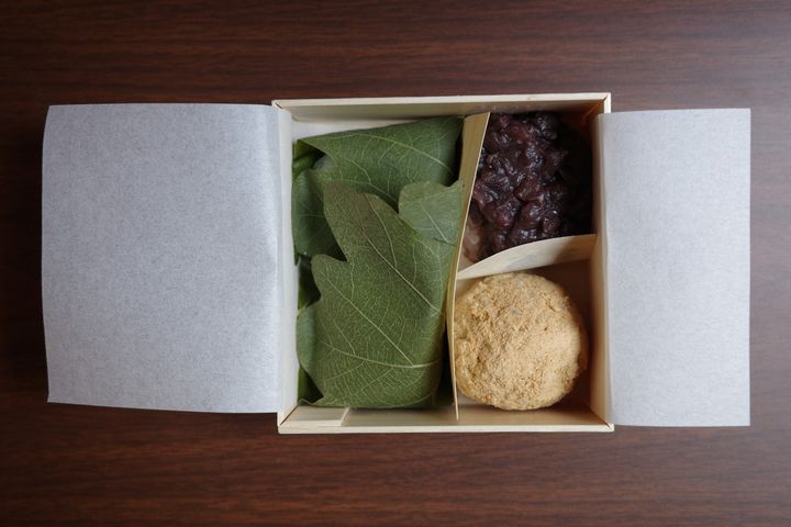 おはぎ(2種)と季節もちの詰め合わせ4個入り ¥1,382(税込)※写真は柏もち(5月中のみ販売)Harumari Inc.