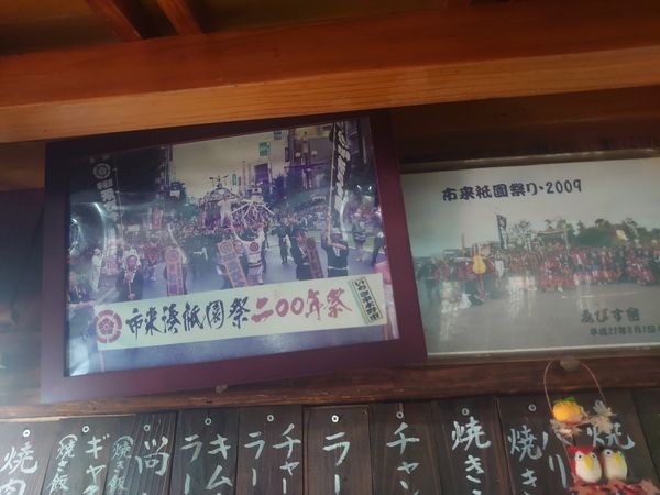 カウンター席の真上には、昔懐かしの木札のメニューと「市来湊祇園祭」の写真がズラリ~と並んでいます。