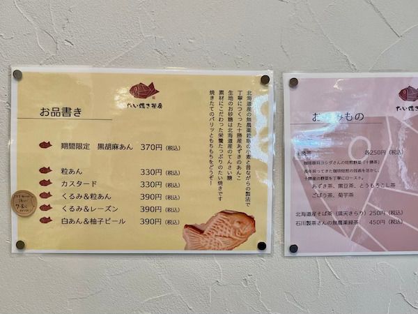 たい焼きは粒あんやカスタードほか、くるみと粒あん、くるみとレーズン、白あんと柚子ピールなど個性豊かなフレーバーがラインナップ。ドリンクはお茶が数種類、250円から楽しめます。