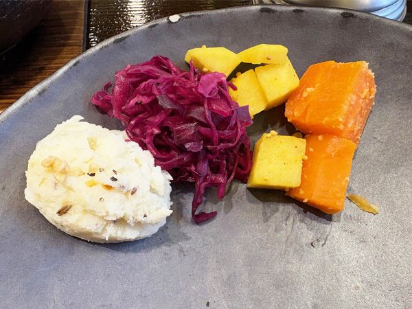 付け合わせは、「マッシュポテト」「紫キャベツのラズベリーマリネ」「大根のウールガイ」「人参のグラッセ」。なめらかなマッシュポテトはピリッとペッパーの風味がアクセントに、紫キャベツは甘酸っぱい味わい、ダイコンはターメリックの苦みとレモンの酸味が印象的、ニンジンは甘い味わいに仕上げてあります。これらをカレーと混ぜ合わせながら食べれば、食感や味の変化が加わり、ご飯もカレーもさらにうま味が増していきます。