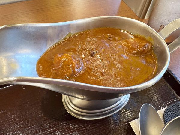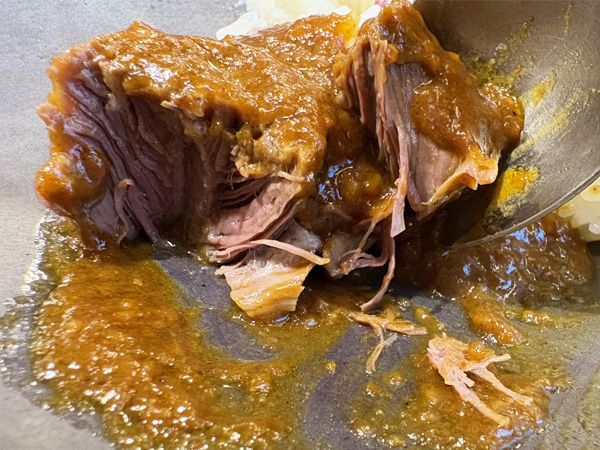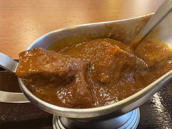カレーを皿の上のご飯の上にかけて…。カレーはフルーティーな甘さが第一印象。食べ進むうちに辛さが増してくる味わいです。牛肉はスプーンでホロリとくずれる柔らかさ。これをご飯と一緒に食べれば、幸福感に包まれました。