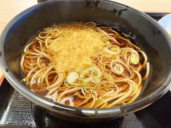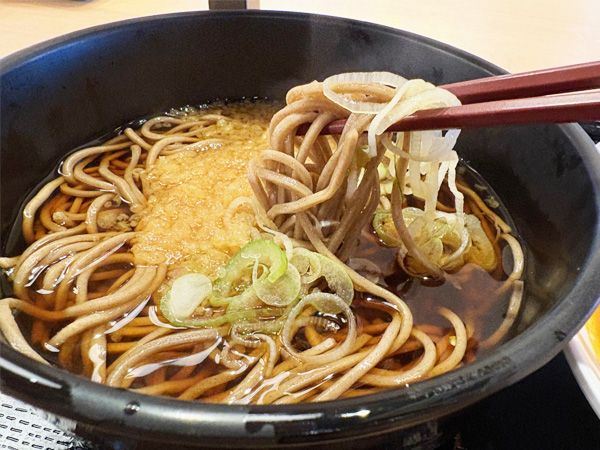 まずは、温かいたぬきそばのつゆをひと口。甘めのだしの味が、なんとも優しい! そばは固めでスルスルとのど越しがいい塩梅です。